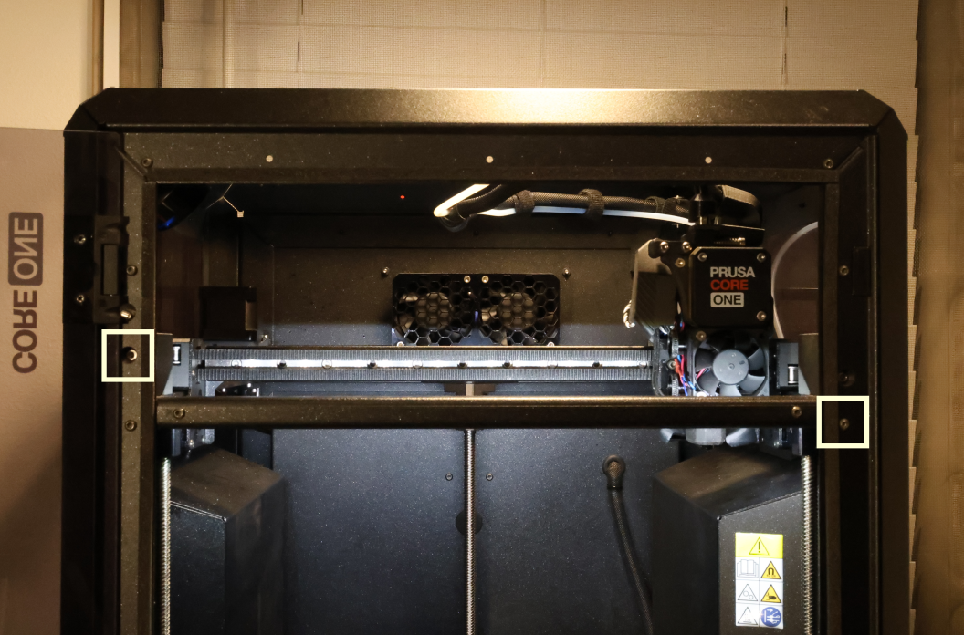 The Prusa Core One uses the so-called "Core XY" scheme, in which the print head's X (left/right) and Y (toward/away) positions are controlled by stationary motors, a long belt, and a system of pulleys. For accurate motions and printing, this scheme requires that the X and Y axes be separated by exactly 90° ("orthogonal"), so that X motions have no effect on the Y dimension and vice versa.