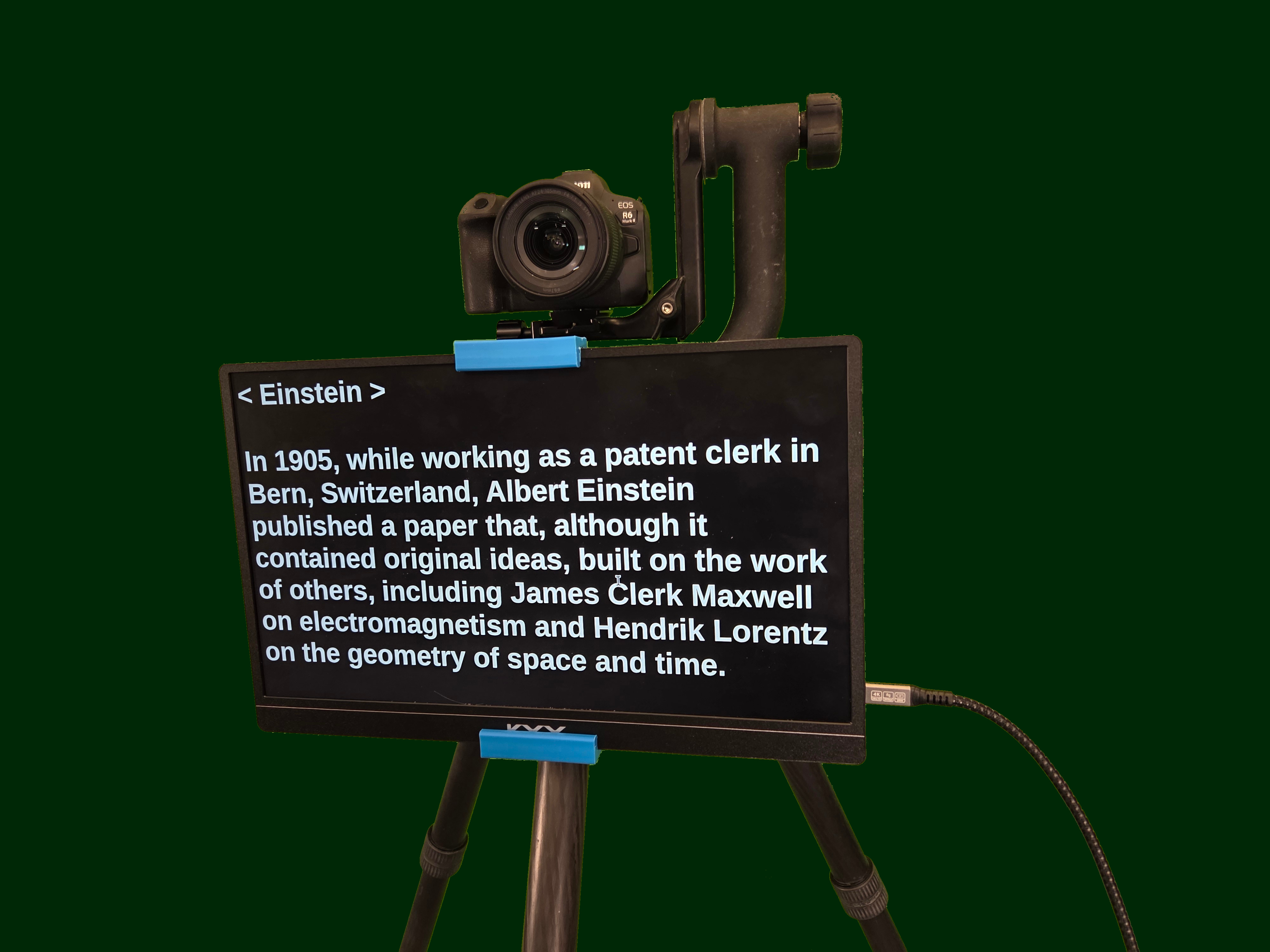 To use the teleprompter display, the user needs to acquire a Bluetooth keyboard paired to the display tablet/phone (update 2026: A laptop and a tripod-mounted display panel works better, see image above). The keyboard serves as a remote configuration and scrolling control, because the tablet's local soft keyboard is inaccessible while the tablet is being used as a teleprompter display.